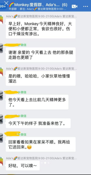 After surgery, Monkey’s recovery from anesthesia was smooth, with no signs of vocalizing, rolling, or other pain-related symptoms. About three days post-op, Monkey began to gradually bear weight on his left hind leg while standing. Around seven days post-op, he was able to walk with all four limbs at a slow pace. After about 10 days of hospital rest and recovery, Monkey was discharged and returned home to continue his recovery. He is now full of energy and recovering very well at home.